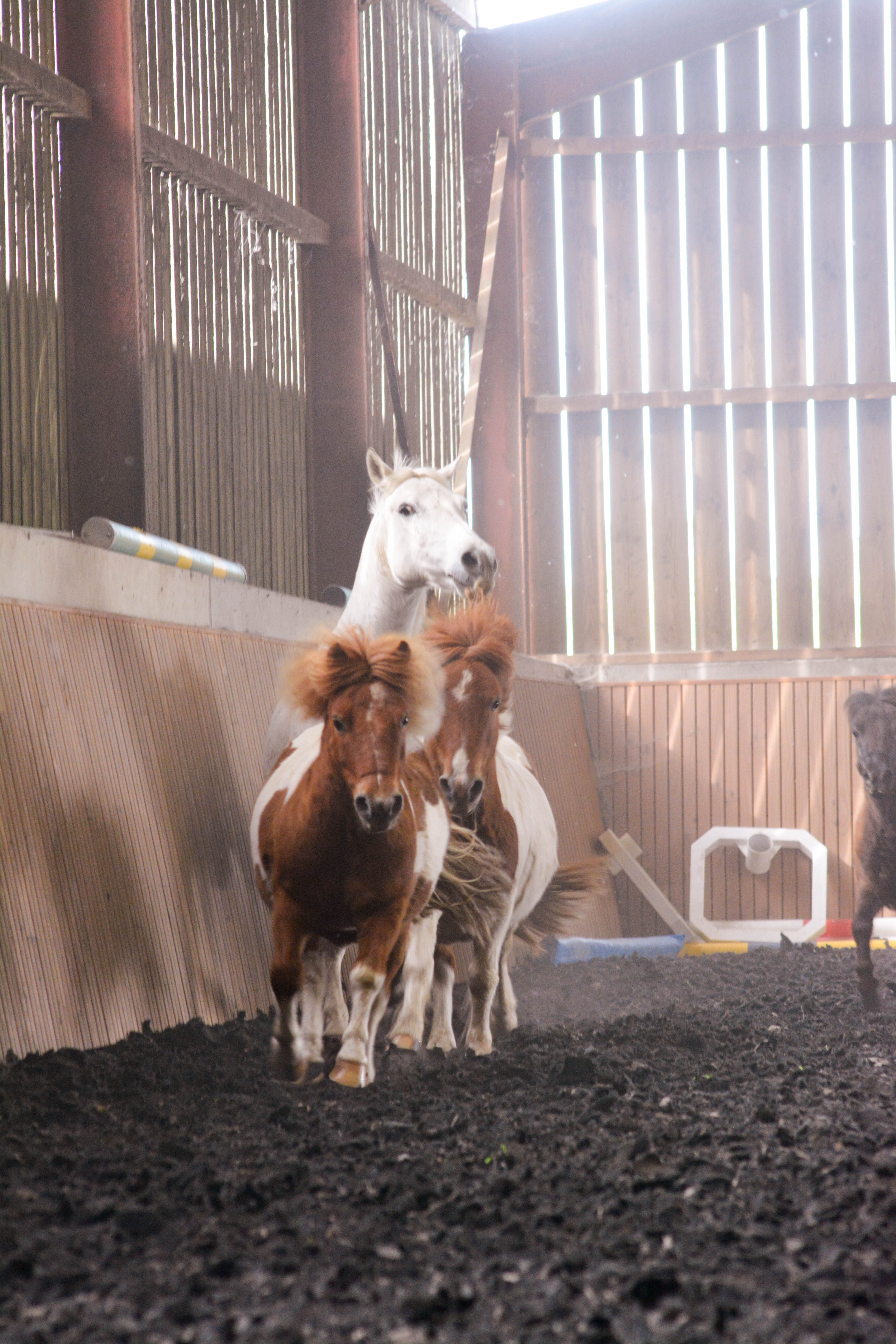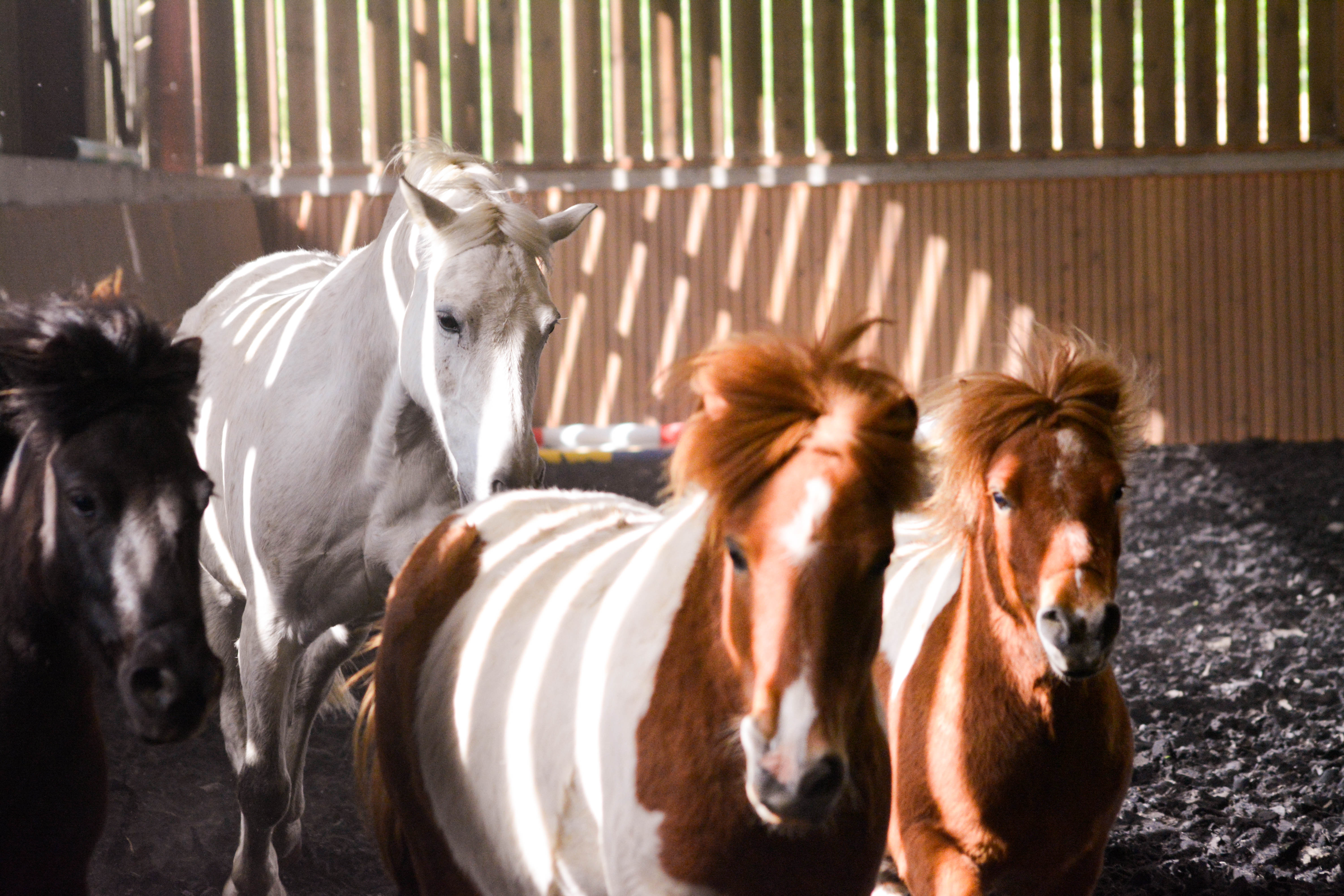 Nous proposons une cavalerie de shetlands, poneys et chevaux heureux de vivre ensemble à l’année au pré, dans une écurie active.